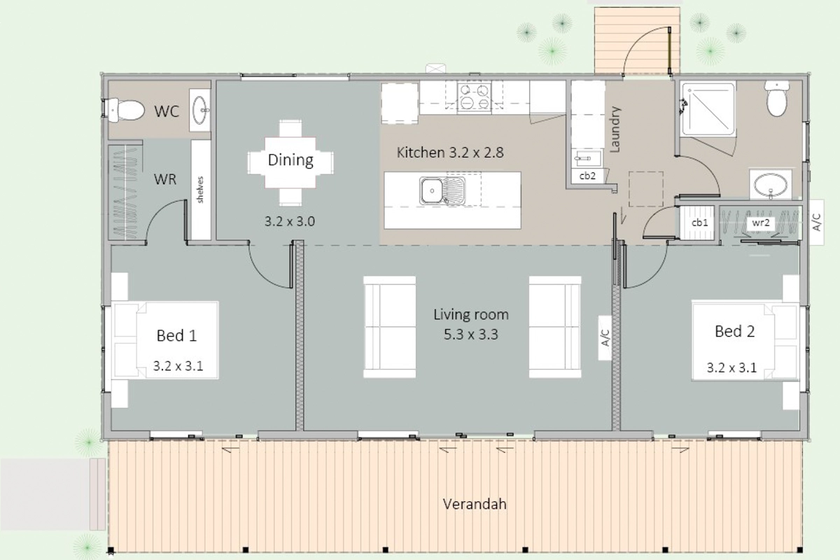 Step into our delightful two-bedroom monopitch East Coast model. Featuring a central living area, 2 bedrooms, and 1.5 bathrooms, this cozy retreat is designed for comfort and style.